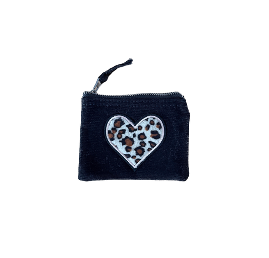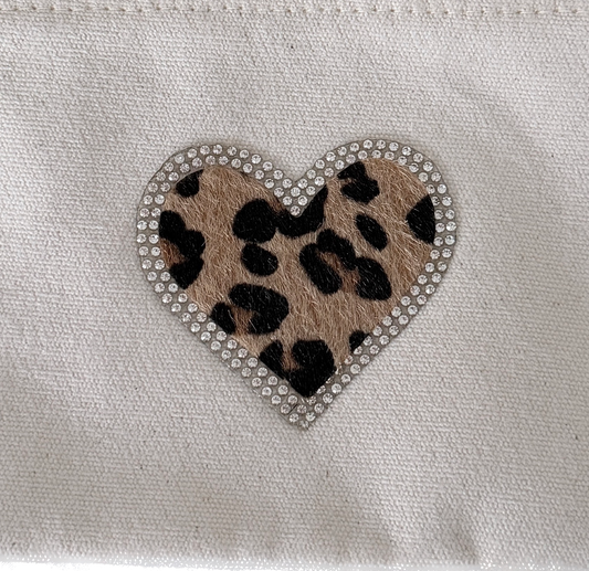 S Schminktasche Beige – Canvas Geldbörse mit Leo Herz Kunstfell & Strass Zipper Etui