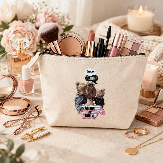 Kosmetiktasche „Super Mama“ Beige Canvas – Schminktasche Make-up Tasche Geschenk Muttertag